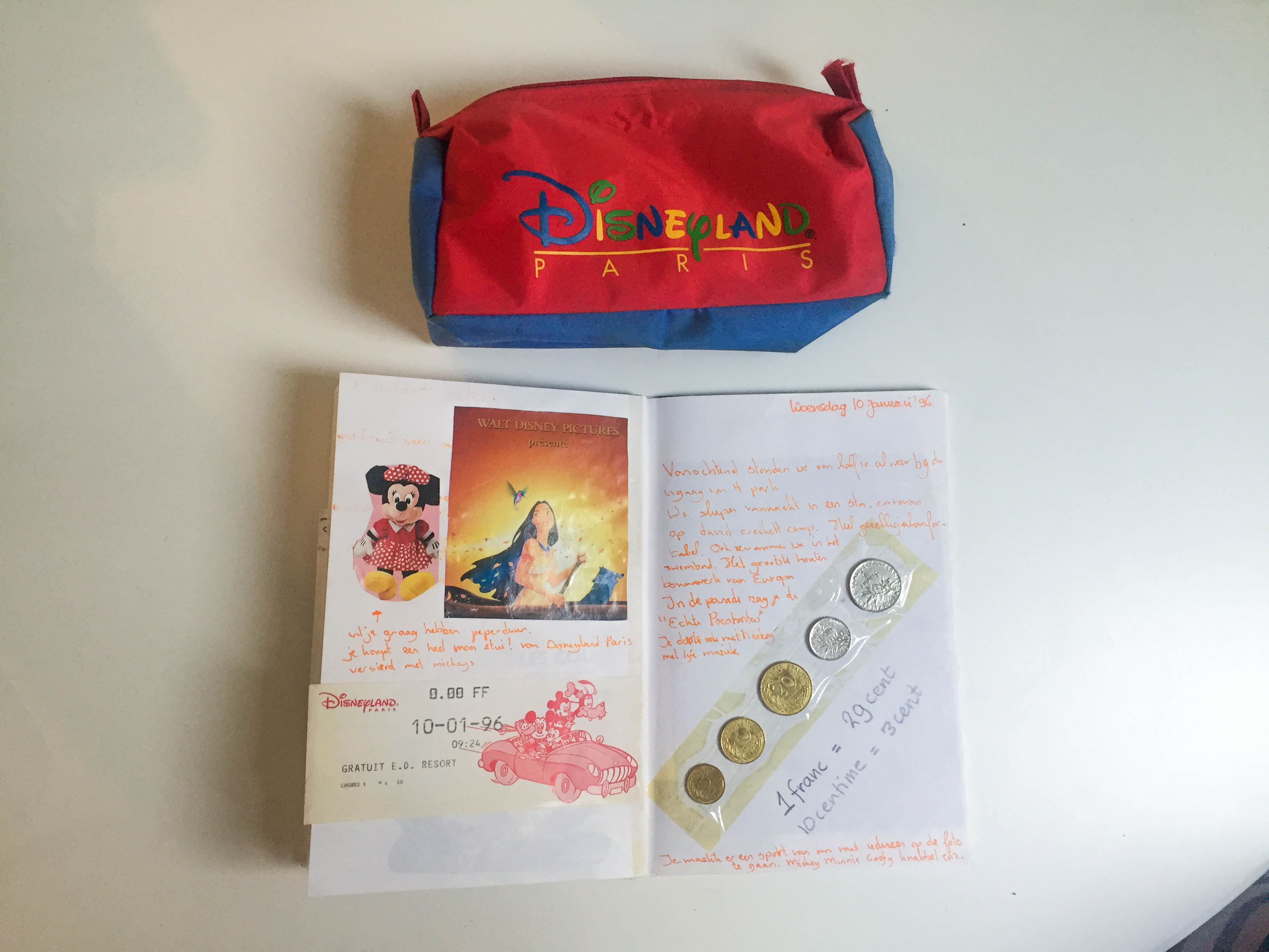 Afgelopen week was ik thuis bij mijn ouders en vond ik juist dat specifieke boekje inclusief het fotoboek én de souvenirs die ik toen heb gekregen. Het is niet meer dan een paar witte a4’tjes met een nietje, een rood fotoalbum van de Hema en een simpel Disneyland etui. Het is vrij weinig en niet veel waard maar ik hecht er juist heel veel waarde aan, want het houdt die herinneringen van 23 jaar geleden nog een beetje vers.